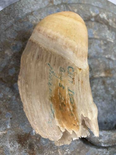 This specimen is a large, genuine Sperm Whale tooth characterized by its curved, conical shape and organic texture. The tooth exhibits a natural range of ivory and cream tones, with significant longitudinal striations and grooves along the surface of the root area. The tip or crown of the tooth appears smoother and more polished, showing a deeper amber-yellow patina indicative of significant age and natural calcification. A standout feature of this specific item is the handwritten provenance or cataloging notes in blue or teal ink, which seem to mention 'CAPT. IVAN' and 'Aug 3', suggesting it may have been a historical nautical souvenir or part of a mid-20th-century collection. Physical condition shows jagged edges and minor losses at the base, likely where it was extracted from the whale's jaw. The material is dense and heavy, showing the classic 'Schreger lines' or cross-hatching when viewed closely at the base, confirming its status as true ivory rather than a resin cast. There is some surface staining and internal cracking (checks) consistent with natural drying over several decades. Its size and curvature suggest it came from a mature bull sperm whale, likely dating to the late 19th or early 20th century.