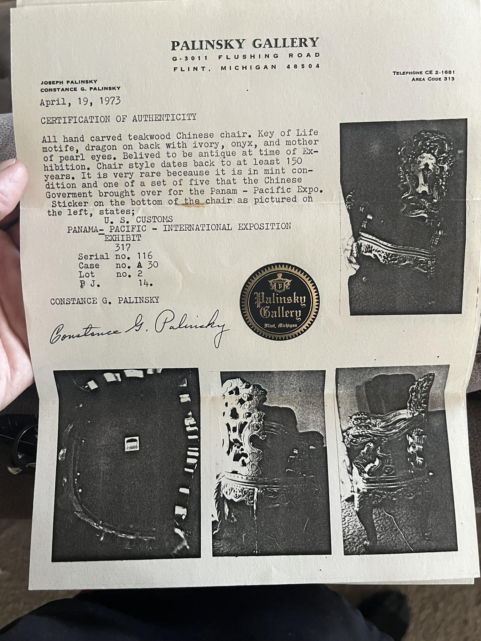 Palinsky Gallery Certificate of Authenticity for a Hand-Carved Teakwood Chinese Chair