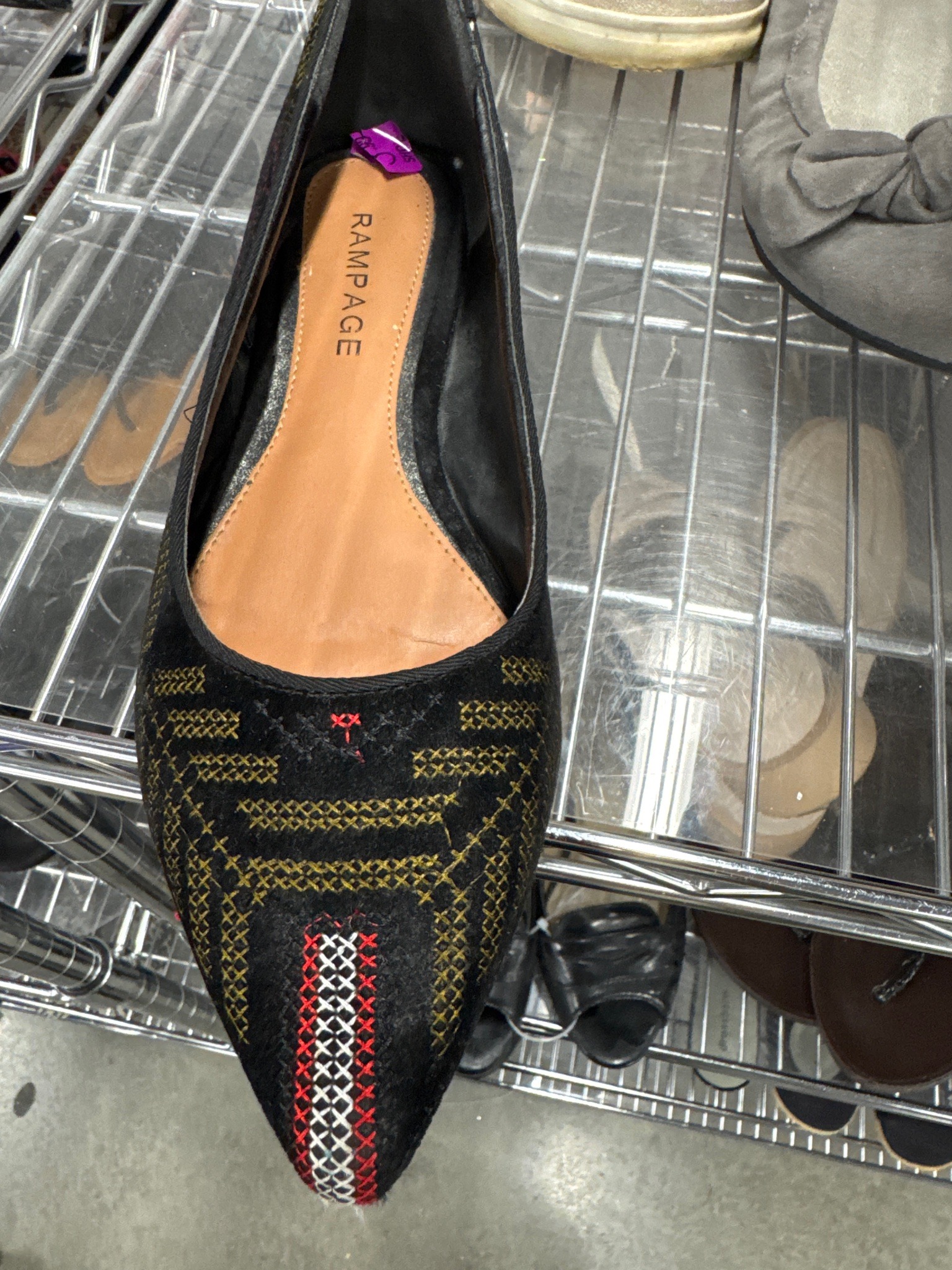 This is a single women's flat shoe featuring a sophisticated pointed-toe silhouette, manufactured by the brand Rampage. The upper is constructed from a black textile material, possibly a synthetic suede or velvet, which serves as a dark backdrop for intricate geometric embroidery. The embroidery is executed in a series of cross-stitch patterns using contrasting thread colors of muted gold, white, and red. A prominent vertical strip of white and red cross-stitching runs down the center of the toe box, flanked by horizontal and vertical golden geometric blocks that resemble architectural or tribal motifs. The interior features a light tan or camel-colored padded insole with the 'RAMPAGE' brand name clearly printed in a black serif font. The shoe is finished with a thin black piping or trim along the collar for structural integrity and a clean visual edge. In terms of condition, the item appears pre-owned; there is visible creasing on the insole and a purple price tag or identifier sticker adhered to the interior heel area, suggesting it is being sold in a secondhand or retail liquidation environment. The craftsmanship reflects a mass-market fashion aesthetic, utilizing machine-guided embroidery and glued construction typical of late 2010s to early 2020s fast-fashion footwear.