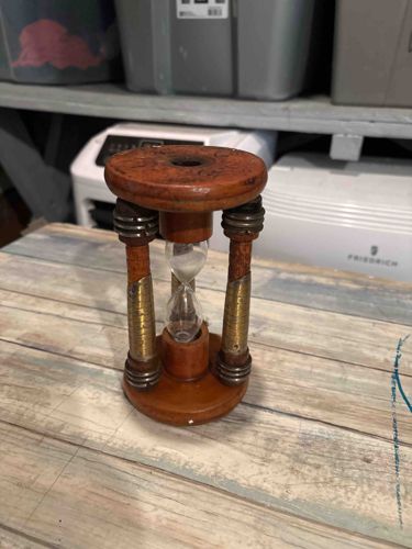 This item is a vintage-style sand timer or hourglass features a distinctive folk-art or nautical-inspired construction. The frame consists of two circular wooden platforms in a warm, medium-toned honey-brown finish, likely oak or pine, connected by four turned wooden spindles. Each spindle is embellished with decorative metal accents, including ribbed pewter-toned rings at the top and bottom and a brass-colored sleeve or ferrule at the mid-section, some of which exhibit a greenish oxidation or patina, suggesting age and varied metal composition. The central glass ampoule is clear with a classic double-bulb silhouette and a narrow waist, containing a fine white sand. Physically, the piece appears to be roughly 5 to 7 inches in height. The top platform shows darkened spots and minor surface scratches indicative of use. The craftsmanship is rustic yet deliberate, with visible grain and minor inconsistencies that suggest a hand-assembled or early-to-mid 20th-century mass-market production piece. There are no visible maker\'s marks in the provided image, but the overall style is reminiscent of mid-century maritime collectibles or office decor. The condition is fair with noticeable wear to the wood finish and tarnished metal elements throughout.