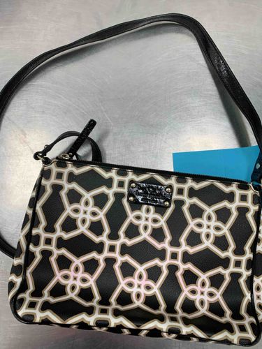 This is a small crossbody bag, likely from the 'Kate Spade New York' brand, featuring a distinctive geometric pattern. The primary colors of the pattern are black, accented with a light beige or off-white and a lighter, possibly blush or faded pink, within the interlocking shapes. The pattern consists of repeating squares and quatrefoil-like motifs, creating a stylish and intricate design. The bag is constructed from what appears to be a durable coated canvas or a similar synthetic material, which gives it a slight sheen and likely provides some water resistance. The trim and the adjustable shoulder strap are black, possibly made of faux leather or a similar material, and show some minor creasing consistent with use. The shoulder strap is thin and appears to be adjustable, allowing for wear across the body or over the shoulder. The top closure of the bag is a zipper, with a small, flat zipper pull attached to a 'D' ring. A notable feature is the rectangular brand plaque on the front of the bag, which is black and has a glossy, patent leather-like finish. The brand name, 'Kate Spade New York', is embossed or printed in a light color (possibly gold or silver) on this plaque, which is secured by two small, metallic studs on either side. There are some faint discolorations or lighter areas within the pattern, particularly visible as a lighter pinkish hue in some of the beige elements, which could indicate wear, fading, or possibly a deliberate design variation. The overall condition appears good, with no major rips or tears visible, but typical signs of gentle use are present, such as the aforementioned strap creasing and minor surface wear commensurate with its presumed age. The bag's construction seems sturdy, with clean stitching visible along the edges. The style suggests a contemporary fashion accessory, likely from the 2010s or later. The size appears compact, ideal for carrying essentials like a phone, wallet, and keys.