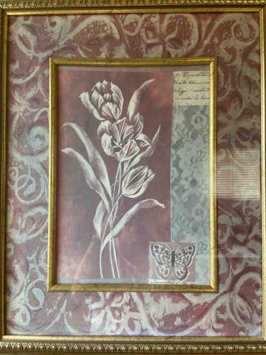 This is a decorative mixed-media style botanical collage housed in a double-gilt wooden frame. The central artwork features a sepia-toned botanical illustration of three tulips with detailed foliage against a mottled burgundy background. To the right of the flowers is a vertical strip showcasing cursive script (likely French or Italian) above a section of pale blue floral lace patterning. At the bottom right corner, a smaller square print depicting a butterfly adds a secondary natural element. The entire composition is surrounded by a wide mat board featuring a tonal burgundy and cream damask scrollwork motif. The outer frame is a classic gold-leafed or gilt-finished wood with beaded detailing along the interior lip, while an inner thin gilt fillet separates the main image from the patterned matting. The style suggests a late 20th-century or contemporary reproduction designed to mimic antique European decoupage or scrapbooking. The condition appears to be good with no visible water damage or foxing on the paper, although there are minor reflections on the glass suggesting it is standard glazing. The craftsmanship is consistent with high-quality commercial home decor art from the 1990s through the early 2000s.