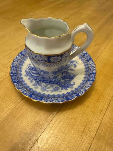 Vintage Flow Blue Chinoiserie Porcelain Creamer and Saucer Set