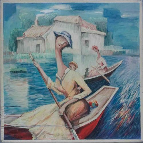 This watercolor on paper measures 1547 x 1547 pixels and showcases a highly stylized, expressionistic scene of figures in boats. The composition is dominated by a central female figure with an extremely elongated neck and a simplified, serene facial expression, wearing a distinct blue hat and a yellowish-tan garment. She holds a long wooden oar that bisects the lower left quadrant of the piece. Behind her, a secondary figure is visible in another small boat, and a third figure appears partially obscured. The background features a rustic white building with a smoking chimney, set against a vibrant blue sky with wispy white clouds. The color palette is a mix of cool blues and teals contrasted with warm terrestrial tones of tan and brown. The application of the watercolor is rhythmic, with visible hatch-like brushstrokes in the water creating a sense of movement and reflection. There are visible horizontal lines or creases in the physical paper substrate, particularly on the left side, which may indicate past folding or structural wear. A faint, illegible signature or marking is located in the bottom left corner. The style is mid-to-late 20th-century Modernism, leaning toward Surrealism or Mannerism through the exaggerated anatomy of the subjects.