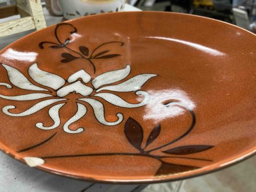 This is a circular ceramic plate, approximately 7 to 8 inches in diameter, likely from the American Atelier brand based on design motifs. The plate features a warm, burnt-orange or terracotta glaze with a subtle speckled or 'salt-glaze' textured finish. The primary decorative element is a large, stylized off-white floral motif on the left side, characterized by flowing, organic lines reminiscent of mid-century modern or art nouveau aesthetics. Dark brown line work depicts stems and smaller leaf accents that complement the central flower. The glaze is high-gloss, reflecting light sharply across the surface. Regarding condition, there is a prominent, jagged chip on the lower-left rim that reveals the white ceramic body beneath the orange glaze. Additionally, fine crazing is visible within the white portion of the floral design, and minor edge wear with small flecks of glaze loss is present along the perimeter. The construction suggests a commercial-grade stoneware or earthenware, likely manufactured in the late 20th century to mimic earlier mid-century styles.