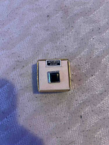 A classic piece of mid-20th-century men's jewelry, this tie tac features a square-cut, polished cabochon of a dark, likely 'imported stone' such as black onyx, hematite, or glass. The stone is set within a simple, minimalist square bezel mounting, likely crafted from silver-toned base metal or sterling silver. It remains in its original presentation box, which features a peach-colored fabric or paper lining and an applied black and white label reading 'IMPORTED STONE.' The mounting shows a clean, industrial design aesthetic typical of the 1950s or 1960s. The stone appears to be in good condition with a high polished luster, reflecting light sharply. The surrounding box displays minor age-related wear and discoloration to the interior lining. This item represents the understated, geometric style of mid-century professional attire, where durability and a clean silhouette were prioritized. The craftsmanship is utilitarian but precise, designed for everyday formal use. The presence of the original store or manufacturer's tag suggests it has been preserved in a collection rather than heavily worn.