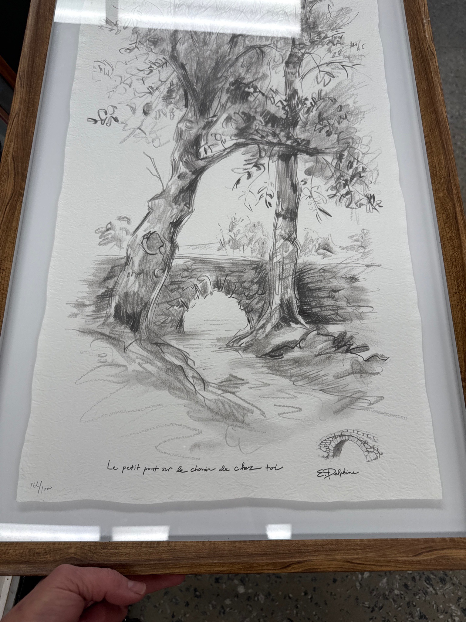 This item is a limited edition lithograph or print of a pencil-style landscape drawing on textured, deckled-edge heavy-weight art paper. The artwork, titled 'Le petit pont sur le chemin de chez toi' (The little bridge on the way to your house), features a central bridge over a stream framed by two prominent trees. The composition exhibits expressive, sketch-like marks with varied graphite tones ranging from light greys to deep near-blacks. Notable markings include a handwritten-style title in French, a signature with a distinct logo of a small stone bridge on the lower right, and a limited edition numbering of '716/1000' on the lower left. The paper has a cream or off-white hue with a visible cold-press texture. It is housed in a modern frame with a wood-grain finish, floating on a white mat board under glass or acrylic. The condition appears excellent with no visible foxing, yellowing, or structural damage to the paper. The deckled edge is deliberately preserved for aesthetic effect. The style suggests a late 20th or early 21st-century production, characterized by a romantic, illustrative aesthetic typical of collectible boutique prints.