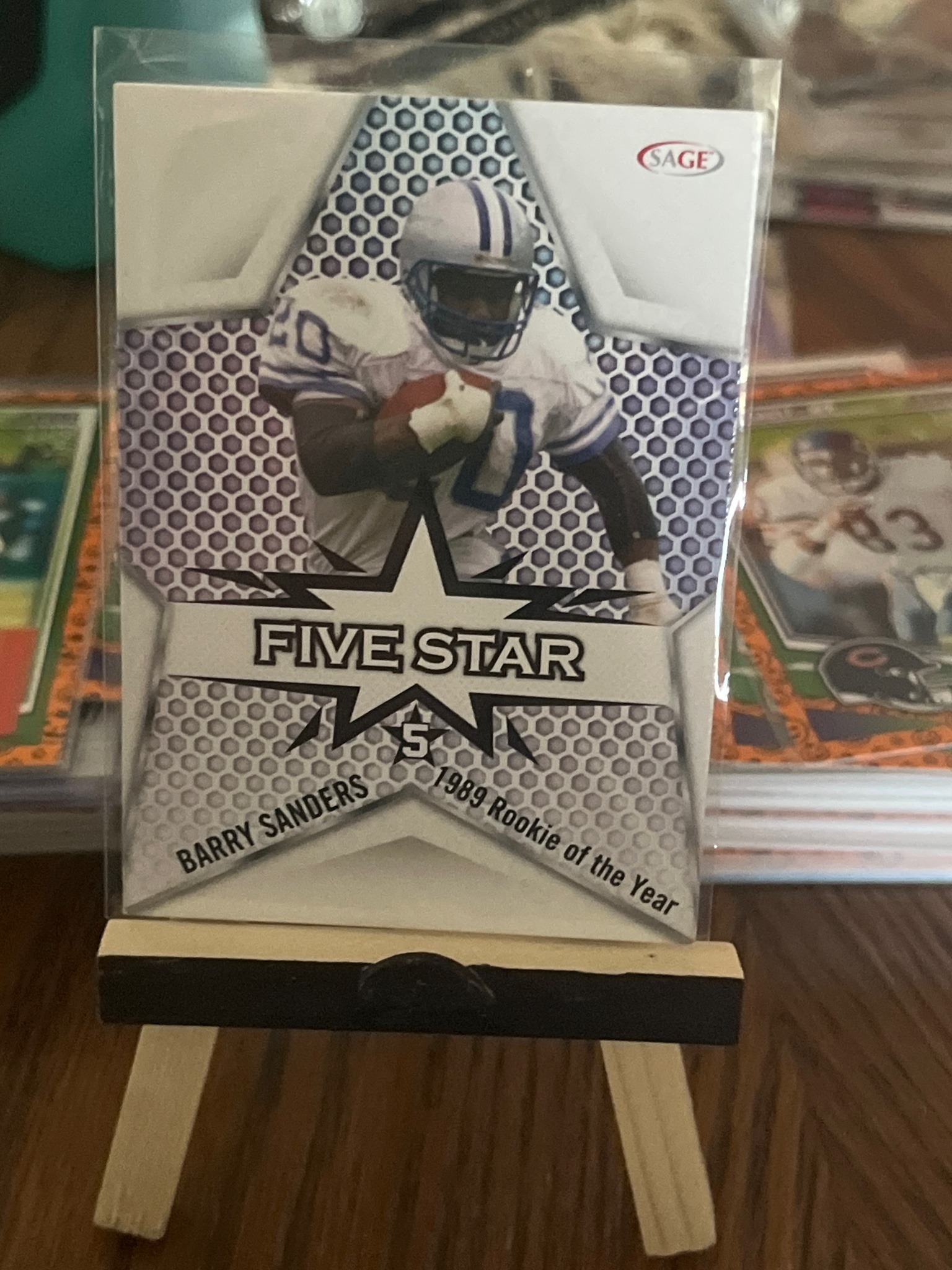 This is a collectible football trading card produced by SAGE Hit featuring NFL Hall of Fame running back Barry Sanders. The card showcases an action shot of Sanders in his Detroit Lions home jersey, set against a modern stylized background featuring a large silver star silhouette and a metallic blue/silver honeycomb hex pattern. The center of the card features the 'FIVE STAR' branding inside a jagged black and white graphic. Text at the bottom identifies the player and commemorates his '1989 Rookie of the Year' achievement. The card is manufactured with high-quality cardstock and a glossy finish, typical of modern hobbyist releases. The SAGE logo is visible in the top right corner. From the image, the card appears to be in Excellent-Near Mint condition, currently housed in a clear protective plastic sleeve and displayed on a miniature wooden easel. The corners appear sharp and the centering looks well-distributed, though a definitive grade would require physical assessment outside of the soft sleeve to check for surface scratches or edge wear. This item represents a licensed modern tribute to a historic sports figure, blending contemporary graphic design with vintage photographic elements.
