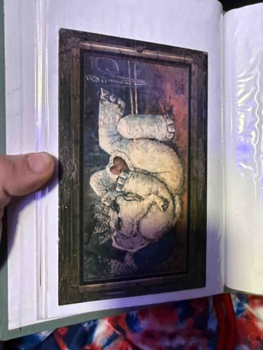 This item is a rectangular art postcard featuring a surrealist illustration of an upside-down elephant. The artwork is printed within a faux-ornate bronze or gold-toned frame border, giving the illusion of a matted painting. The central figure is a heavily stylized, white/grey textured elephant appearing to tumble or be suspended vertically against a dark, moody background of deep blues and reddish-brown hues. Notably, the elephant features a red heart-shaped mark or void on its torso. The construction appears to be standard cardstock with a semi-gloss or matte finish, typical of museum or gallery souvenir postcards. In terms of condition, the postcard is currently housed within a protective plastic sleeve of an album; it shows some minor edge wear and slight corner rounding, but no major creases or tears are visible. The style is contemporary surrealism, likely late 20th or early 21st century, characterized by expressive, thick brushwork textures in the print and a whimsical yet dark narrative tone. No artist signature is clearly legible on the front, though there is a small marking or logo in the bottom left of the inner frame. The craftsmanship of the print is high-quality with deep color saturation.