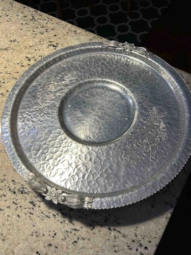 This is a circular serving platter crafted from hand-hammered aluminum, a style that peaked in popularity during the mid-20th century, specifically the 1930s through the 1950s. The tray features a distinctive 'hammered' texture across its entire surface, which provides a multi-faceted sheen when reflecting light. It is decorated with intricate repoussé or stamped floral motifs, specifically showing dogwood blossoms or wild roses with accompanying foliage. The tray incorporates a central recessed well, likely designed to hold a small dip bowl or a specific food item. Two ornate handles are integrated into the rim, featuring cast floral and ribbon-like flourishes that overlap the edge. The edges are finished with a delicate pie-crust or scalloped crimping. No visible maker’s mark is present on the front, though items of this style were frequently produced by companies like Rodney Kent, Continental Silver Co., or Everlast. The condition appears fair to good with a visible aged patina, minor surface scratches, and some localized oxidation spots typical of vintage aluminum. The craftsmanship represents a high-quality example of the Art Deco or Mid-Century American giftware movement.