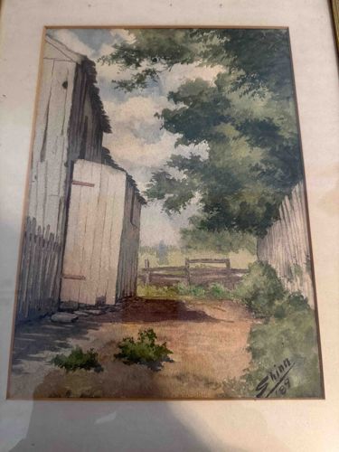 This original work of art is a watercolor and graphite painting on paper, executed in a naturalist style featuring a rural farmyard or alleyway scene. The composition is vertically oriented, dominated by a large barn-like wooden structure on the left with a partially open door, and a dense, leafy green tree canopy overhanging from the right. The color palette consists of muted earthy tones, including ochre, sage greens, slate blues, and soft vandyke browns. The artist utilizes light and shadow effectively, with a strong cast shadow across the dirt foreground suggesting a bright, directional light source. In the lower right corner, the piece is prominently signed 'Shinn' in a stylized script, accompanied by the year '89' (likely 1889). Based on the signature and stylistic execution, the work is attributed to Everett Shinn (1876–1953), a member of the Ashcan School, though this particular piece represents his very early, formative output before his move toward more urban, gritty subjects. The paper shows signs of age-appropriate toning and minor foxing throughout the cream-colored matting. The painting appears to be housed in a simple gilt wood frame under glass. The brushwork shows a delicate yet confident application characteristic of high-quality late Victorian-era amateur or emerging professional illustration.