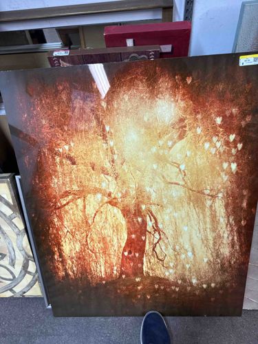 This piece consists of a large, high-gloss image printed directly onto a rectangular metal substrate, likely aluminum. The artwork features a central weeping tree silhouette rendered in deep sepia and sienna tones against a luminous, golden light background. A whimsical overprint of small white heart symbols is scattered throughout the branches and ground, creating a bokeh-like effect. The construction utilizes modern dye-sublimation techniques, resulting in a vibrant, reflective surface that enhances depth. The color palette is dominated by warm earth tones: amber, gold, mahogany, and burnt orange. Visually, the piece is in good condition with high surface gloss, though a minor white sticker or residue is visible on the upper right corner, likely from a retail environment. No significant denting or warping of the metal plate is observed. There are no visible artist signatures on the front, suggesting it may be a contemporary decor piece or a boutique production. The style is modern romantic with a touch of abstract impressionism, likely manufactured within the last decade. The back of the panel likely features a recessed frame for a 'floating' wall mount effect common for this medium.