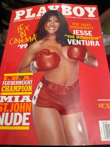 This is a standard-sized consumer periodical magazine, specifically the November 1999 issue of Playboy. The cover features professional boxer Mia St. John, depicted wearing red boxing gloves and trunks against a vibrant red background. The masthead 'PLAYBOY' is printed in white at the top. Notable typographic features include headlines for a Jesse Ventura interview and the 'Sex in Cinema '99' feature. The magazine is constructed with a glossy paper cover and a perfect-bound spine. A UPC barcode is visible in the lower-right corner with a printed original price of $4.95. Condition-wise, the magazine shows moderate wear typical of its age; there is visible creasing across the top-right corner of the cover and some slight edge wear and blunting at the corners. There is also a vertical indentation or crease running down the right side near the barcode. The color remains saturated, and the graphic layout is characteristic of late 20th-century publication design. This specific issue is historically significant within the publication's run for featuring a professional female athlete on the cover during the height of the 1990s boxing era.