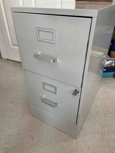 This is a standard industrial-style two-drawer vertical filing cabinet constructed from cold-rolled steel with a light gray or 'putty' powder-coated finish. The unit features a rectangular footprint designed for letter-sized or legal-sized document storage. Each drawer front is equipped with a silver-toned metal pull handle and a matching rectangular label holder for identification. A notable security feature is the plunger-style lock located on the right side of the lower drawer, with keys currently inserted, suggesting a functional locking mechanism that likely secures both drawers simultaneously. In terms of condition, the cabinet appears to be in good used condition with minor surface abrasions, small scuffs, and slight soil marks visible on the light-colored finish, particularly around the drawer edges and base. The construction is typical of late 20th or early 21st-century office furniture, prioritizing utility and durability. The lack of visible external branding suggests it may be a product of a mass-market manufacturer like Hon, Hirsh, or Staples. The edges are slightly rounded, and the overall aesthetic is utilitarian, making it suitable for both professional office and home storage environments.