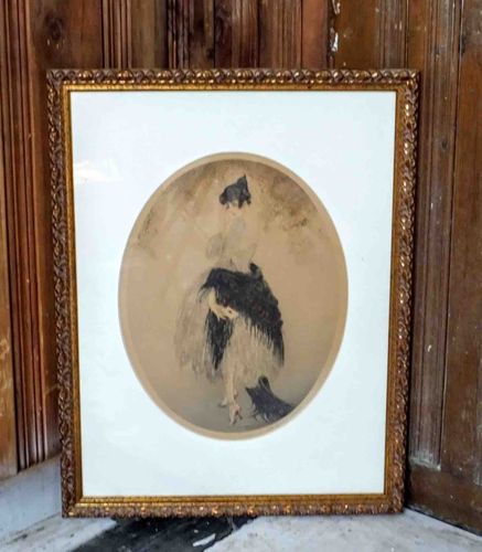 This artwork is a framed print, likely a drypoint etching or lithograph, featuring a central oval composition. The subject depicts a woman standing in a three-quarter view, elegantly dressed in a voluminous skirt and holding a dark shawl or fabric piece. A small dark dog is visible at her feet towards the bottom right of the oval. The style is evocative of the Belle Époque or Art Nouveau periods, reminiscent of the work of artists such as Louis Icart. The artwork is presented within a large white mat board and a rectangular gilt wood frame with ornate carved floral patterns or scrolled detailing around the perimeter. The frame size is approximately 1487 x 1701 mm. The colors consist of muted sepia tones and neutral washes, accented by bold black inks in the woman's hair, clothing, and the dog. Notable features include the soft, atmospheric rendering of the background within the oval border. Condition-wise, the paper shows signs of age-related toning (patina), appearing slightly darker within the oval cutout compared to the mat. The frame exhibits minor surface wear consistent with age, though the overall presentation remains intact and decorative. No artist signature is clearly visible in the provided image, though such works were commonly signed in pencil in the lower margins under the mat.