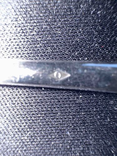 This item is a piece of metal flatware, likely a handle section of a fork or spoon, featuring a polished silvery finish. The primary distinguishing feature is a small, stamped hallmark within a lozenge (diamond) shape, containing what appears to be a stylized character, possibly a 'C' or an 'O'. Diamond-shaped marks are frequently associated with French silver or silverplate manufacturers from the 19th and 20th centuries. The surface exhibits a high-gloss metallic sheen consistent with silver plating (electroplated nickel silver). The item shows evidence of use and handling, including light surface abrasions, micro-scratching, and some visible dust or particulate matter on the surface. The construction is solid and appears to be cast or forged metal tailored for everyday dining use. While the exact maker is difficult to determine without additional letters in the mark, the craftsmanship is representative of mass-produced commercial tableware from the early to mid-20th century. The condition is fair to good, with no major bending or structural failure visible in the provided view, though the presence of patina suggests moderate age.