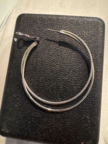 This item is a single, large-scale hoop earring featuring a sophisticated double-circlet design. Its construction consists of two distinct concentric metal bands: an inner band with a textured, rope-like twist or cable pattern, and an outer band with a high-polish, smooth tubular finish. The metal displays the bright, cool tone characteristic of sterling silver or high-polished white gold. It is designed with a traditional saddleback or 'omega' style hinge closure, which facilitates a secure fit while providing a seamless aesthetic. The diameter appears significant, suggesting a contemporary or modern fashion style likely dating from the late 20th century to the present. The craftsmanship is evident in the precise soldering where the two hoops meet at the hinge and post. While no clear hallmarks are visible in the provided image, the weight and luster suggest a precious metal composition rather than standard costume jewelry. The condition appears to be excellent with a high surface shine and no visible signs of metal fatigue, heavy tarnishing, or structural distortion. The contrast between the textured cable and the smooth mirror finish is a classic design element often associated with high-end designer brands.