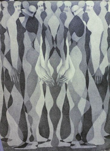 This is an original artwork featuring a stylized, monochromatic figural composition executed in a stippled or pointillist technique. The piece displays a dense arrangement of elongated human figures that interweave through a rhythmic use of light and shadow, creating a harlequin or diamond-patterned optical effect across the bodies. The palette is strictly grayscale, utilizing varying densities of black ink or paint on a light ground to achieve form and depth. Physically, the work demonstrates a sophisticated understanding of mid-20th-century figurative abstraction, reminiscent of Surrealist or Social Realist influences. The figures possess serene, mask-like facial expressions and oversized, expressive hands positioned centrally, which serve as a focal point. The construction indicates a high level of technical patience, as the entire image is built from minute dots. While the artist is unknown, the style reflects a professional level of craftsmanship, likely dating from the 1960s to the 1980s. The surface appears matte with a slight graininess characteristic of ink on paper or a textured canvas. No immediate structural damage is visible in the image, though minor edge wear or faint foxing consistent with age should be expected upon physical inspection. The composition is notable for its symmetrical balance and the seamless blending of individual forms into a collective whole.