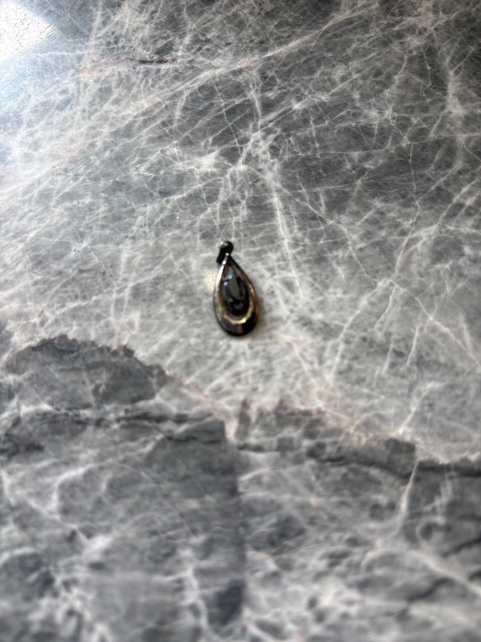 This item is a small jewelry pendant featuring a teardrop or pear-shaped design. The central element is a cabochon-cut black stone, likely onyx or obsidian, which exhibits a smooth, polished surface with a glassy luster. The stone is securely set within an outer metal frame that follows the same teardrop contour. The metal appears to be a dark-toned silver or base metal with a significant amount of surface oxidation and tarnish, giving it an aged, dark grey appearance. The construction includes a simple fixed bail at the narrow top end for attachment to a chain or cord. In terms of condition, the metal frame shows visible signs of surface wear, including minor scratches and a heavy patina that suggests the piece has some age, possibly dating back to the late 20th century. There are no immediately visible maker's marks or hallmarks in the provided view, suggesting it may be a mass-produced or artisan piece rather than fine jewelry. The craftsmanship is functional and straightforward, typical of costume or fashion jewelry. The contrast between the dark stone and the weathered metal provides a gothic or minimalist aesthetic.