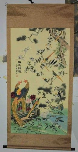 This is a large-format Asian hanging scroll painting, likely of Chinese origin, depicting 'The Hundred Birds Greeting the Phoenix.' The central focus features a male and female phoenix (Fenghuang) perched on an ornamental rock, surrounded by peonies and a diverse array of various bird species including cranes and smaller songbirds set within a landscape of pine trees and water. The artwork is executed in the Gongbi or meticulous realist style, characterized by highly detailed brushwork and a rich polychrome palette including greens, yellows, blues, and reds. The medium appears to be ink and mineral pigments on either silk or treated paper, professionally mounted onto a fabric scroll with a decorative border and a weighted wooden roller at the base. Notable features include a vertical column of calligraphic text accompanied by two red artist seal stamps on the left-central side of the composition. In terms of condition, the mounting displays significant foxing and brown oxidation spots throughout the upper and lower fabric sections, consistent with age and exposure to humidity. The painting itself shows minor creasing from rolling and some slight fading of colors, but the composition remains vibrant. Based on the stylistic execution and the condition of the mount, the piece likely dates from the late 19th to mid-20th century.