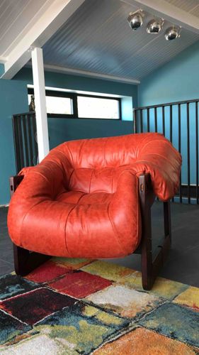 This is a Mid-Century Modern lounge chair, model MP-97, designed by the renowned Brazilian architect and designer Percival Lafer circa the 1970s. The piece features a solid tropical hardwood frame, likely Jacaranda or Rosewood, characterized by rich, dark tones and a sculptural, sled-style base. The seating element is an exceptionally plush, oversized bucket-style cushion upholstered in a vibrant burnt orange or terracotta leather. A signature feature of this model is the 'wrapped' appearance of the upholstery over the wooden side rails, secured by visible oval-shaped wooden pegs or dowels. The leather displays professional tufting and deep ruching, which provides both a luxurious texture and ergonomic comfort. The construction utilizes high-quality dense foam and internal suspension typical of Lafer's 'puffed' aesthetic. Regarding condition, the leather shows a well-preserved patina with natural variations in grain and slight creasing consistent with age and occasional use. The wooden frame appears sturdy with minimal scuffing near the floor contact points. The craftsmanship reflects the premium standards of Brazilian Modernism, focusing on the juxtaposition of hard tropical woods and soft, organic upholstery shapes.