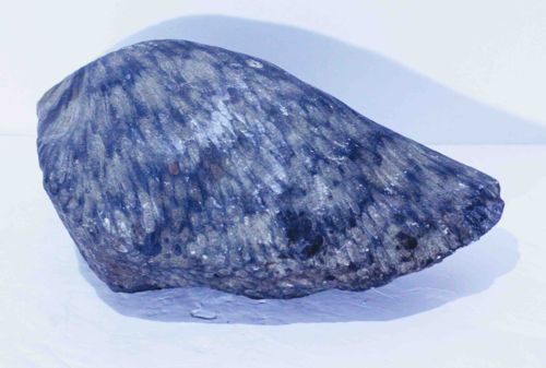 This is a hand-carved contemporary sculpture of an abstract, biomorphic form, most likely executed in a hard decorative stone such as basalt, diorite, or a dark soapstone. The piece features a rich, variegated coloring including deep blues, grays, and charcoal tones, with a textured surface reminiscent of a wing or a fossilized organism. The craftsmanship is evident in the rhythmic, vertical chisel marks or striations that cover the body, suggesting movement and an organic, feathered texture. The shape is aerodynamic and tapered, resting on a flattened base. From a condition standpoint, the piece appears well-preserved, with its rough-hewn texture masking minor surface abrasions; however, some natural fissures or minor chips may be present along the narrower trailing edge. There are no visible maker's marks or signatures, which is common for contemporary abstract studio pieces. The style suggests a late 20th-century or 21st-century origin, balancing industrial material with organic, naturalistic inspiration. The quality of the stone selection and the consistency of the hand-carved scoring indicate a high level of artistic skill and aesthetic intent.
