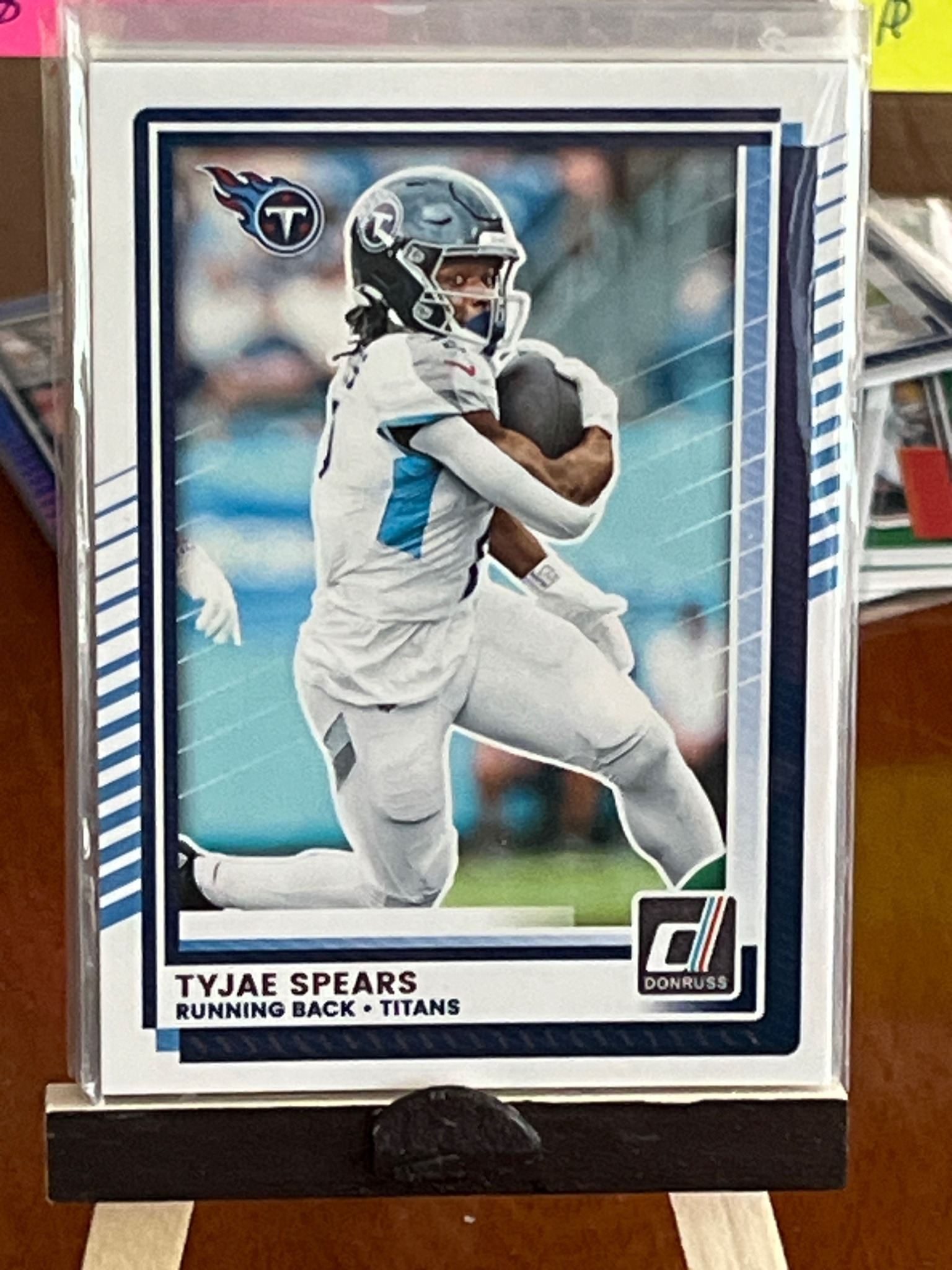 This is a 2023 Panini Donruss football trading card featuring Tyjae Spears, running back for the Tennessee Titans. The card is a standard 2.5 by 3.5-inch rectangular format made of glossy cardstock. The design features a high-action color photograph of Spears in his white and light blue Titans uniform and navy helmet, cradling the football while in motion. The color palette is dominated by the Titans' team colors: navy blue, light blue, and white. The Donruss logo is prominently displayed in the bottom right corner, and Spears' name, team, and position are printed in bottom border text. A distinctive navy blue border with diagonal white line accents frames the central image. The Tennessee Titans primary logo is located in the upper left corner. The card appears to be in Excellent to Near-Mint condition, housed in a clear protective plastic penny sleeve. The edges look sharp and the surface shows no obvious scratches or creases, although the centering appears slightly weighted toward the left border. This card is part of the 2023 NFL rookie class set, marking Spears' debut year in the league, which is a key factor for collectors. The craftsmanship follows the consistent high-volume production standards of Panini’s Donruss line, known for crisp printing and vibrant colors.