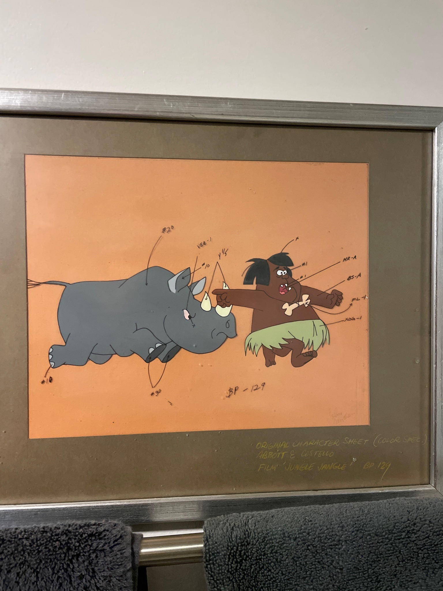 This is an original hand-painted animation production color model sheet featuring a rhinoceros and a stylized indigenous character. The sheet is painted on a vibrant orange background on paper or thin board, approximately 10x12 inches, though the exact dimensions are obscured by the matting. The artwork features extensive technical notations in ink, including color codes and lead lines (e.g., #20, #30, #10, HR-A, 85-A) used by the ink-and-paint department to ensure consistency across frames. The style is characteristic of late 1960s television animation, specifically identifying the 'Abbott & Costello' series. The character designs utilize flat, saturated colors and bold black outlines. The rhinoceros is depicted in grey tones, while the human character features a brown skin tone, green grass skirt, and a bone necklace. The piece is titled in gold ink on the lower right of the mat: 'ORIGINAL CHARACTER SHEET (COLOR SPEC.) ABBOTT & COSTELLO FILM "JUNGLE JANGLE" BP. 129.' It is housed in a contemporary silver-toned frame with a dark khaki-colored mat. Visible condition appears fair to good; there are some small spots or foxing visible in the upper center and right portions of the orange field, as well as slight waviness to the paper, suggesting it was once removed from a studio binder or peg system. There is a faint graphite signature or mark visible on the lower right of the orange sheet, which may be an animator's or production manager's initials.