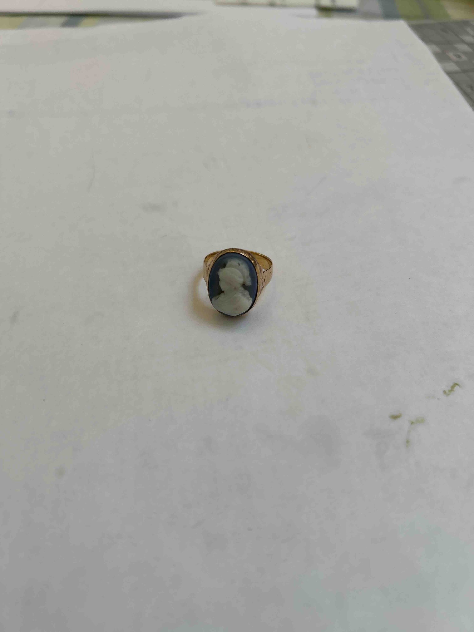 This is a vintage cameo ring featuring a white-on-blue bas-relief portrait, constructed in a classical style. The centerpiece is an oval-shaped cameo, likely crafted from Jasperware (pottery) or molded glass, depicting the side profile of a female figure with a detailed coiffure. The cameo is securely held in a bezel setting made of yellow gold, which appears to be approximately 10k to 14k based on its warm luster. The ring's shoulders exhibit subtle decorative floral or scroll-like engravings, tapering into a slim polished band. In terms of condition, there is visible surface wear and a light patina on the gold elements, consistent with regular use over several decades. The blue background of the cameo shows some slight darkening or staining near the edges of the white relief, which is typical for vintage ceramic cameos. No significant chips or cracks are immediately apparent in the portrait itself. The overall craftsmanship suggests a mass-produced but high-quality piece likely dating from the mid-20th century (circa 1940s-1960s), referencing Victorian Neo-Classical revival aesthetics. The scale appears to be a standard cocktail or statement ring size, designed for elegant daily wear.