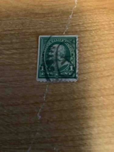 This item is a 1-cent United States postage stamp featuring the profile of Benjamin Franklin, printed in a deep green ink. Based on the design, it appears to be from the Washington-Franklin issue series, likely dating between 1908 and 1922. The stamp features a central portrait of Franklin facing left, encircled by a frame with the text 'UNITED STATES POSTAGE' at the top and the denomination 'ONE CENT' with the numeral '1' at the bottom corners. The stamp is printed on paper with standard perforations along all four edges, although the perforation on the right side appears slightly irregular or jagged. A heavy black circular date stamp (CDS) or machine cancel is visible across the center of the image, indicating the stamp has been used. The centering of the design within the margins appears slightly shifted toward the bottom left. The overall condition shows signs of aging consistent with a circulated antique stamp, including slight toning of the paper and blurring of the cancellation ink. Further identification of the specific Scott catalogue number would require examination of watermarks and perforation gauge measurements.