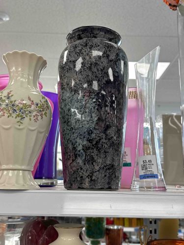 This item is a medium-sized decorative ceramic vase featuring a distinctive mottled or marbled glaze intended to mimic the appearance of natural gray granite or salt-and-pepper stone. The vessel exhibits a classic ovoid or ginger jar-inspired body that tapers slightly toward a flat base, topped with a short, flared rim. The surface treatment consists of a complex, layered glaze with various shades of charcoal, slate gray, and off-white speckles, finished with a high-gloss protective overglaze that creates significant surface reflections. This specific aesthetic was highly popular in mass-produced home decor during the late 1980s and 1990s. The construction appears to be slip-cast ceramic, as evidenced by its uniform shape and standardized rim. While no manufacturer markings are visible from the front, the style is reminiscent of commercial pottery intended for retail giftware or floral arrangement. In terms of condition, the vase shows no immediate chips or cracks on the primary face, though minor shelf wear on the unglazed base is expected. The high-gloss finish remains intact, highlighting the faux-stone pattern. This item represents a turn-of-the-century modern decorative style, prioritizing visual texture and sheen over the high-value materials it seeks to emulate.