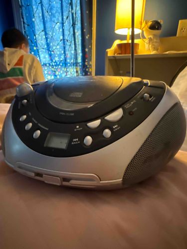 This item is a late 1990s to early 2000s portable CD radio player, commonly referred to as a 'boombox.' The unit features a distinctive rounded, aerodynamic 'egg-style' design popular in consumer electronics of the Y2K era. It is constructed primarily of injection-molded plastic with a two-tone silver and matte black color scheme. The top-loading CD compartment occupies the center, featuring a transparent viewing window with the 'Compact Disc Digital Audio' logo. Control elements include tactile buttons for play/pause, stop, skip/search, and volume, along with a top-mounted volume dial. A small monochrome LCD display is positioned on the front panel to show track numbers. Integrated metal mesh speaker grilles are located on both sides of the chassis to accommodate the stereo output. There is a metal telescopic antenna visible for AM/FM radio reception. Condition-wise, the unit shows significant signs of use, including surface dust, grime buildup in the crevices, and light scuffing on the plastic housing. The user notes that the speaker is currently non-functional, which suggests localized internal component failure, such as detached wiring, blown capacitors, or a faulty amplifier circuit. No specific manufacturer logo is clearly legible in the image, but the design is consistent with entry-level mass-market brands of the period.