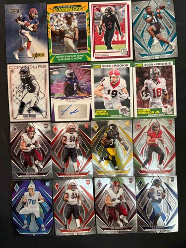 A diverse lot of sixteen sports trading cards consisting primarily of modern NFL football cards, with one vintage-style baseball card. The collection features various brands including Panini Phoenix, Score, and Donruss Optic. A highlight of the group is an autographed Marvin Mims Jr. card with a blue ink sticker signature and holographic detailing. The collection includes high-profile 2024 scouting prospect and rookie cards for players like Brock Bowers, Marvin Harrison Jr., and Rome Odunze. The majority of the cards (9 items) are Panini Phoenix inserts characterized by their distinctive geometric, chrome-like foil etching and 'RC' rookie logos. These cards exhibit vibrant color schemes, with one purple parallel card featuring Joe Alt. The collection spans various card constructions from thick cardstock with glossy finishes to premium chromium-based surfaces. Condition appears generally good with sharp corners visible on most items, though slight surface wear or minor edge whitening can be expected on unprotected cards. Markings include manufacturer logos, set names, player positions, and team affiliations. Notably, the group contains a 'Baseball Flashbacks' card depicting Willie McCovey, styled after 1970s Topps designs. Overall, the lot represents contemporary sports card manufacturing with a focus on rookie talent and modern refractive printing technologies.
