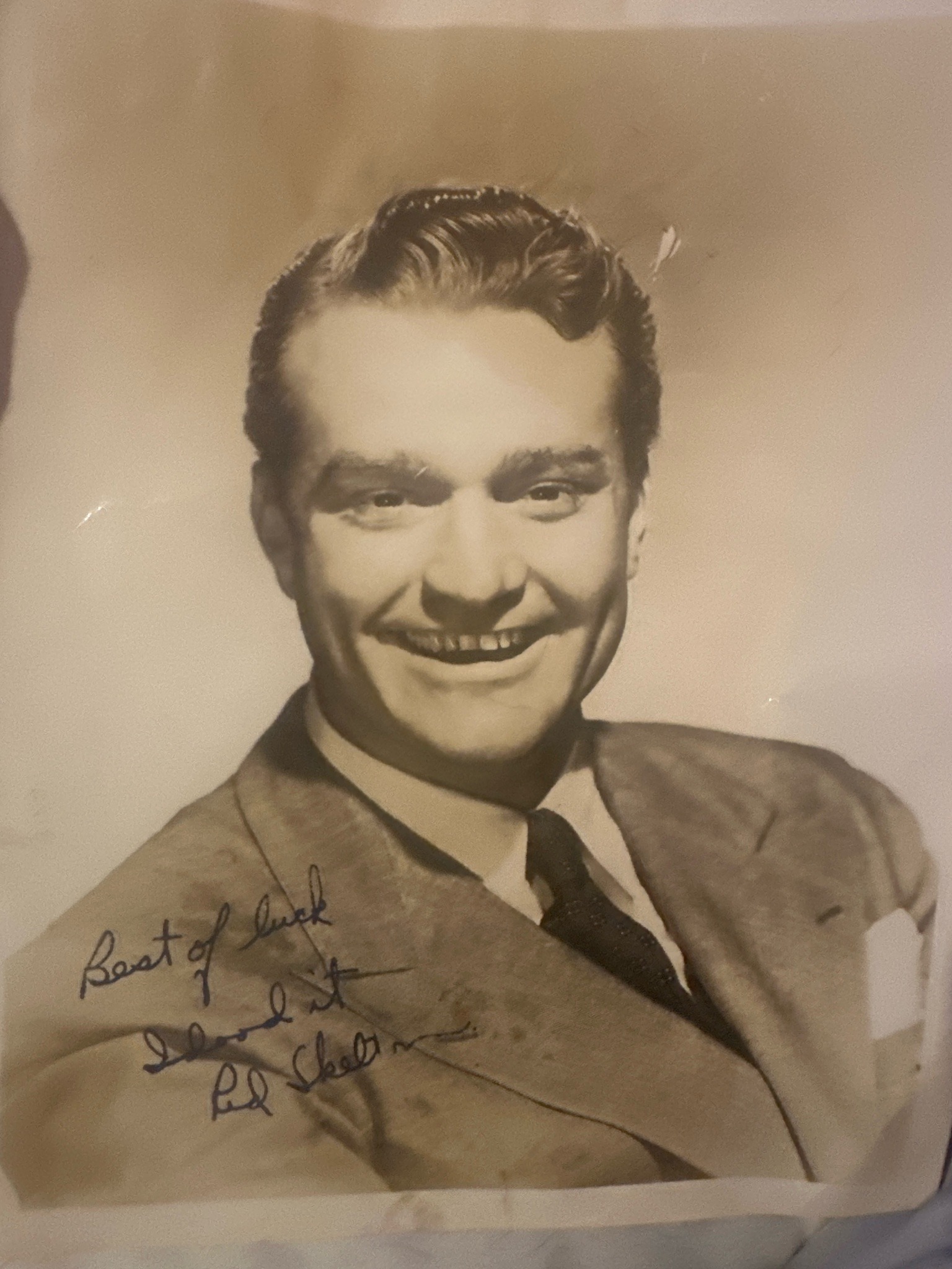 This item is an original black-and-white (sepia-toned due to age) headshot photograph of the famous American entertainer Red Skelton, dating from approximately the 1940s to 1950s. The photo depicts a youthful, smiling Skelton wearing a broad-lapeled suit jacket, a white collared shirt, and a dark necktie. The image features a personalized inscription in dark ink located on the lower left portion of the subject's jacket, which reads: 'Best of luck, I dood it, Red Skelton.' The catchphrase 'I dood it' was one of Skelton's most famous lines from his radio and film career, specifically associated with his 'Junior, the Mean Widdle Kid' character. Physically, the photograph appears to be a standard glossy or semi-glossy studio promotional print. Regarding condition, there are visible signs of aging and wear including moderate surface creasing (notably on the left side and top right), some edge wear, and staining/discoloration spots near the bottom center and signature area. The ink shows good saturation, though a professional authentication would be required to verify the signature's hand-signed status versus a pre-printed facsimile. The lighting and composition are typical of mid-century Hollywood studio portraiture, designed for fan distribution and promotional use.
