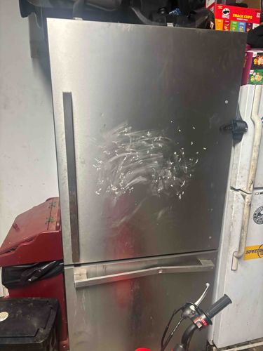 This is a contemporary-style, two-door refrigerator featuring a bottom-mount freezer configuration. The exterior is constructed primarily from brushed stainless steel, though the prominent smudges and circular markings on the face suggests it may not have an anti-fingerprint coating. The upper refrigerator compartment is equipped with a long, vertical bar handle on the left side, indicating a right-hinged door. The bottom freezer section features a horizontal pull-out drawer handle. Physically, the item shows significant signs of use and lack of maintenance. The front surface is heavily marred with white, streaky residue, possibly from cleaning agents or impact scuffs. There are visible small dents or 'dings' across the main door panel. On the right edge, an aftermarket child safety lock has been adhered, which may leave permanent residue or discoloration if removed. The surrounding environment suggests it is currently being stored in a garage or similar utility space, next to a smaller white refrigerator. While no manufacturer logo is clearly visible on the front, the minimalist design, sharp squared-off edges, and handle geometry are characteristic of modern appliance brands like Samsung, LG, or KitchenAid from the last 10 to 15 years. The overall condition is graded as fair to poor based on the heavy surface contamination and cosmetic damage, though its functionality cannot be determined from the image alone.