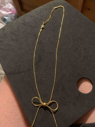 This jewelry piece consists of a slender, high-polish gold-tone snake chain necklace featuring a decorative fixed bow motif at the bottom. The chain is constructed of tightly linked round metal plates characteristic of the snake style, providing a smooth, flexible, and skin-friendly texture. The focal point is a stylized bow formed by the chain itself, looping through a central spherical keeper or bead that secures the bow's shape. Two tails of the chain extend downward from this central node. The piece features a lobster claw or spring ring clasp integrated with a standard curb link extender chain, allowing for adjustable length. Based on the uniform yellow-gold coloration and the specific construction of the extender and clasp, this piece appears to be contemporary costume jewelry, likely made of gold-plated brass or a similar alloy. The condition appears to be very good with no visible kinks in the snake chain—a common point of failure—and minimal signs of tarnishing or plating wear on the high-contact areas of the loops. The aesthetic reflects a feminine, minimalist chic style popular in mass-market fashion jewelry from the late 20th to early 21st century.