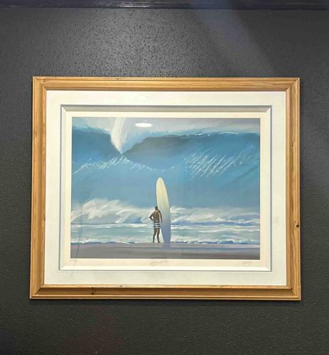 This is a limited edition serigraph (fine art silkscreen print) by the renowned artist Ken Auster, depicting the legendary surfer Greg Noll standing on the shore at Pipeline with his iconic longboard. The piece is a 'Printer's Proof' or specific small-batch edition, numbered 13/50 in the lower left margin. This particular work is double-signed: once by the artist Ken Auster (1949–2016) in the lower right, and once by the subject, surfing icon Greg 'Da Bull' Noll, in the center margin. The composition features high-contrast blues and whites, capturing a towering wave cresting behind Noll, who is wearing his signature black-and-white striped board shorts. The print is professionally housed in a light-toned natural wood frame with a double mat using archival-quality materials, including a white top mat and a thin blue inner mat that echoes the colors of the ocean. The physical construction appears sturdy. The serigraph shows a high level of craftsmanship with clean color saturation characteristic of Auster’s surf-inspired impressionism. Condition-wise, the artwork appears well-preserved behind glass with no visible foxing, fading, or moisture damage. The frame exhibits minor surface wear consistent with display but remains structurally sound. This piece represents a significant cross-over of surf history and contemporary coastal art, dating likely to the late 20th or early 21st century.