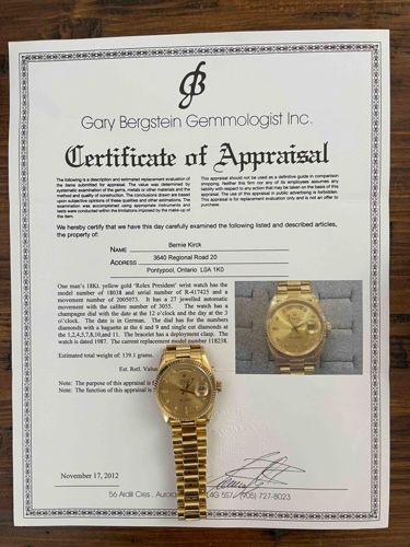 Men's Rolex Day-Date 'President' Wristwatch with Jewelry Appraisal Certificate