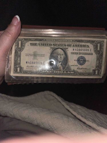 This item is a United States $1 Silver Certificate, characterized by the blue Treasury seal on the right and the blue serial numbers 'W 41665026 I'. The note features the standard small-size currency dimensions and portrays George Washington in the center circular frame. Notable text includes 'SILVER CERTIFICATE' at the top and 'ONE DOLLAR IN SILVER PAYABLE TO THE BEARER ON DEMAND' at the bottom. The signatures of the Treasurer and Secretary of the Treasury are visible at the bottom. Physically, the note is housed in a clear protective plastic sleeve within a spiral-bound album, suggesting it is part of a collection. Regarding condition, the paper shows visible signs of aging including some foxing or brownish staining along the bottom edge and corners. There are vertical crease marks consistent with folding through circulation. The edges appear slightly worn, though the note is largely intact without major tears. This type of currency was last produced in the mid-20th century, specifically the Series of 1935 or 1957, making it a vintage piece of American numismatic history. The blue ink is a key quality indicator for silver certificates, distinguishing them from the green-seal Federal Reserve notes used today.