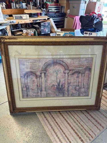 This item is a large-format decorative art print housed in a substantial gilded ornate frame, likely dating from the mid-1990s (consistent with the provided context of 30 years). The artwork features a transitional or neoclassical aesthetic, depicting a series of weathered stone archways and columns that resemble a Roman ruin or a Mediterranean fresco. Centrally positioned within the main arch is a botanical element, specifically a lily or amaryllis-type flower, rendered in soft, muted tones of terracotta, sage green, and cream. The print is professionally double-matted with an off-white outer mat and a darker accent inner mat, adding depth to the visual presentation. The frame is constructed of wood or a heavy composite material with an antiqued gold finish, featuring rococo-style scrolling details at the corners and a fluted texture along the rails. Regarding condition, there is visible surface wear and significant scuffing along the bottom edge of the frame where the gold finish has been rubbed away to reveal the lighter base material. The paper matting shows slight signs of acidification or age-related discoloration, common for items of this era. This piece represents high-end commercial home decor from the late 20th century, designed to provide a grand, classical feel to a living space.