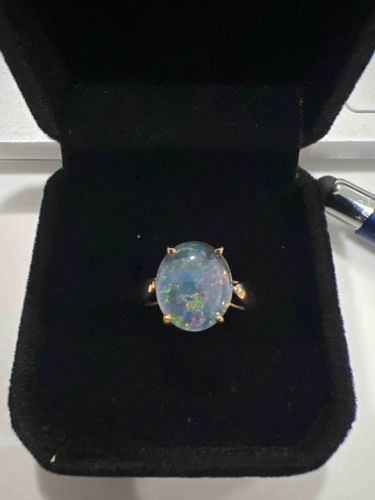 This item is a solitaire gemstone ring featuring a prominent oval-shaped black opal, measuring approximately 11.7x10mm. The opal is set in a four-prong mounting made of polished yellow gold, likely 14k or 18k based on traditional fine jewelry standards. The gemstone exhibits a dark, translucent body color with a vibrant play-of-color, showing scattered flashes of green, red, orange, and blue across its surface in a pinfire or small harlequin-like pattern. The stone's cabochon cut is high, giving it a significant profile. The mounting features a classic, minimalist style with a solid band and delicate prongs that maximize the stone's visibility. While the interior hallmarks are not visible in the image, the craftsmanship suggests a late 20th-century or modern vintage period. The condition appears excellent with no visible chips to the stone or deformation of the prongs, though minor surface scratches on the gold band consistent with light wear may be present upon closer inspection. The overall presentation is that of a high-quality piece of fine jewelry where the rare opal serves as the central focal point.