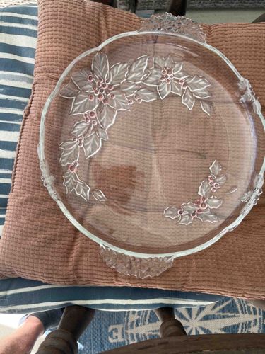 This is a vintage-style circular serving platter or cake plate crafted from heavy, clear pressed glass. The item features a prominent holiday motif consisting of frosted or etched poinsettia flowers, holly leaves, and small raised berries colored in a muted pink or light cranberry hue. The design is asymmetrical, with a large cluster of foliage on the upper left and a smaller sprig on the lower right. The platter is characterized by two integral tab handles with scalloped, textured edges that mimic the leaf pattern found on the interior. These handles provide a secure grip for serving. The glass itself appears thick with a smooth polished surface in the clear areas, contrasting with the frosted textures of the floral designs. The overall construction is suggestive of late 20th-century mass-produced decorative glassware, likely from the 1980s or 1990s, consistent with Mikasa's 'Holiday Bloom' or similar seasonal lines. Structurally, the platter appears to be in excellent condition with no visible chips, cracks, or heavy scratching on the surface. The colored berries show no signs of peeling or fading, and the frosted etching remains crisp. The piece is high-quality for consumer-grade glassware, exhibiting clear clarity without noticeable air bubbles or inclusions.
