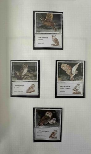 This is a collection of four Israeli postage stamps, each featuring a different species of owl native to the region. The set includes depictions of the Eagle Owl, Barn Owl, Bruce’s Scops Owl, and the Hume's Tawny Owl. Each stamp is printed in a multi-color lithographic style with high-detail illustrations showing the birds in their natural habitats. A significant feature of these items is the attached 'tabs' at the bottom of each stamp, which is a hallmark of Israeli philately. These tabs provide textual descriptions in both Hebrew and English, along with secondary small-scale illustrations of the birds. The stamps are mounted on a light gray grid-patterned album page. Physically, the stamps appear to be in Mint Never Hinged (MNH) or very fine condition, with clean white borders, crisp serrated perforations, and no visible foxing, creases, or surface scuffs. The printing quality is sharp, indicating modern late-20th-century production. The color palette across the set utilizes naturalistic earthy tones like ochre, brown, and slate grey to represent the nocturnal birds. This specific series is part of a thematic nature issue, highlighting Israel's biodiversity and environmental conservation efforts. The craftsmanship of the offset printing allows for fine feather detail and realistic lighting effects on the birds' plumage.