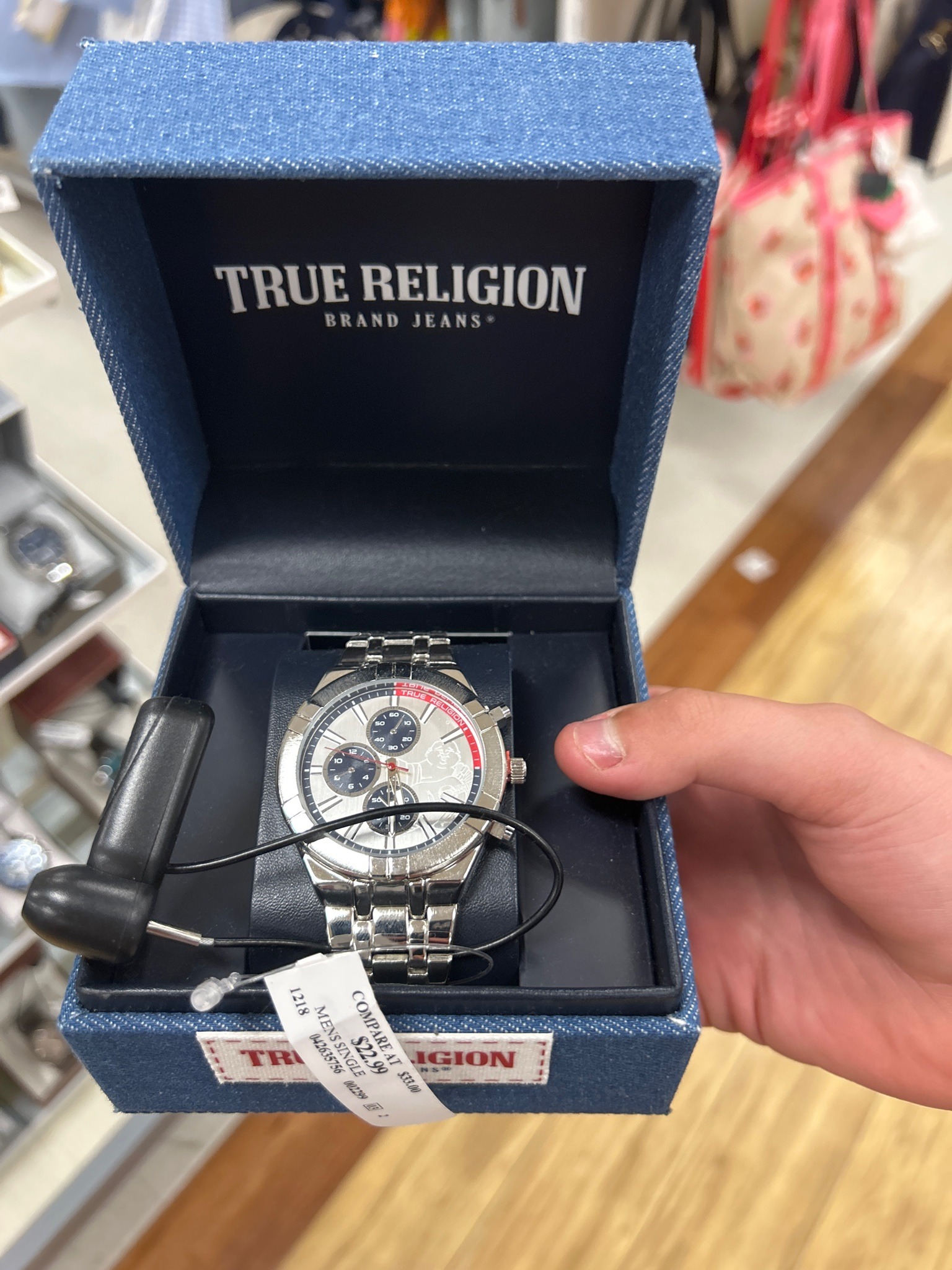 This is a True Religion brand men's wristwatch, featuring a polished stainless steel-toned metal construction with a link-style bracelet and a fold-over deployment clasp. The timepiece features a silver-toned sunray dial with three black sub-dials that mimic a chronograph aesthetic. A notable design element is the red and white 'True Religion' curved text detail located between the 12 and 2 o'clock positions, along with a subtle, etched graphic of the brand's 'Buddha' mascot on the right side of the dial face. The watch is housed in its original blue denim-textured presentation box, which is characteristic of the fashion brand's aesthetic. The box interior is lined with a dark blue material and features the 'TRUE RELIGION BRAND JEANS' logo in bold white print on the underside of the lid. The watch appears to be in new-with-tags condition, as evidenced by the plastic security tag and retail labeling still attached. The craftsmanship reflects typical mass-market fashion watch standards, prioritizing brand identity and lifestyle aesthetics over luxury horological movement quality. It includes two functional pushers flanking the crown, likely used for adjusting day/date or timing functions depending on the movement. No visible scratches or signs of wear are apparent on the crystal or case, although some minor shelf wear is visible on the presentation box's exterior edges.