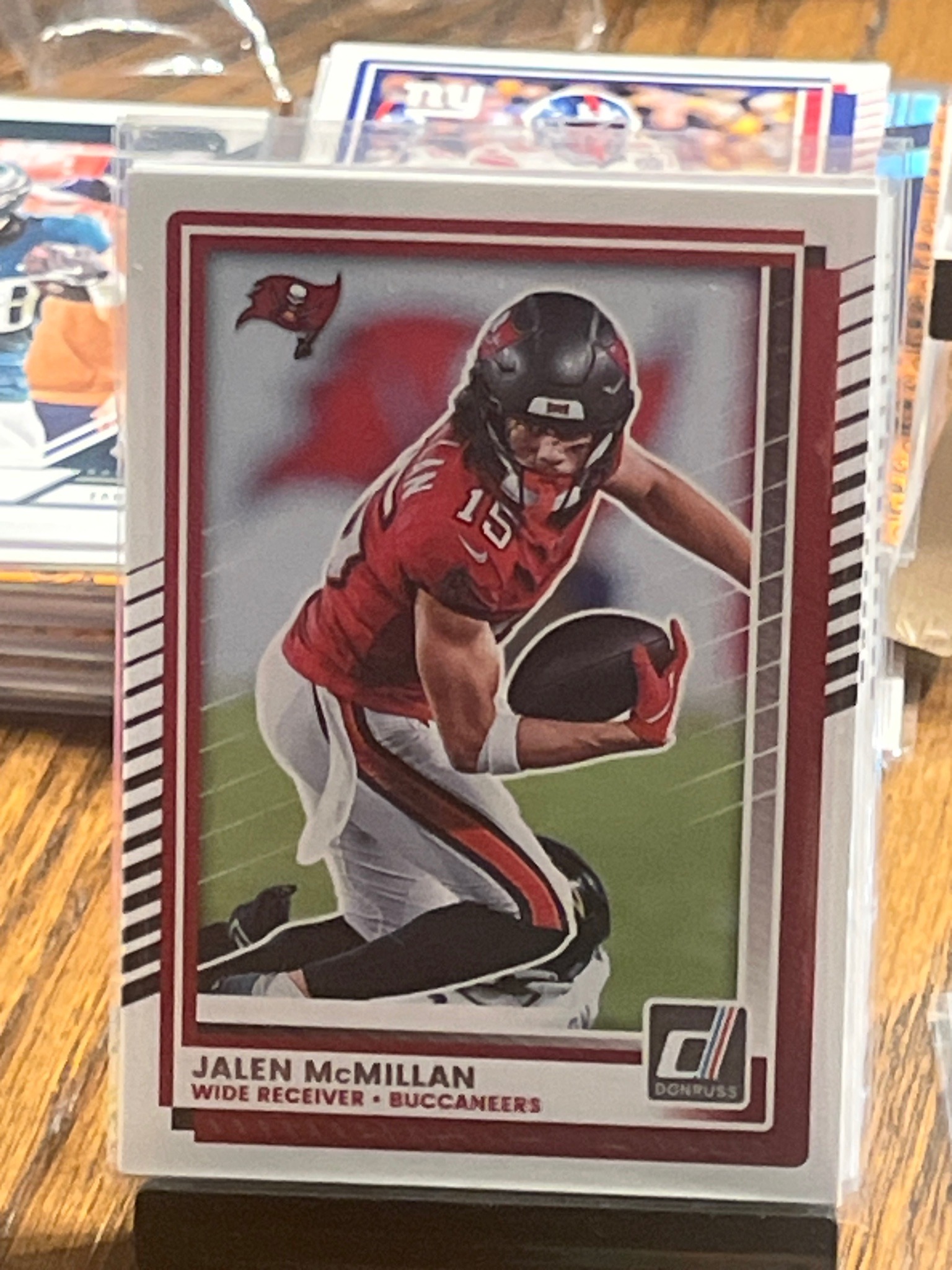 This is a standard-sized modern football trading card measuring 2.5 by 3.5 inches, featuring wide receiver Jalen McMillan of the Tampa Bay Buccaneers. The card is produced by Panini under the Donruss brand, likely from the 2024 set. The design features a white border with a maroon interior frame accented by black and white diagonal 'warning' stripes along the left and right edges. The central image shows McMillan in full Buccaneers uniform (red jersey, white pants) securing a football while falling to the turf. The Buccaneers flag logo is positioned in the upper left corner, while the 'D' Donruss logo occupies the lower right corner. A sleek nameplate at the bottom identifies the player in bold black lettering along with his position and team name in maroon. The card appears to be in an uncirculated or near-mint condition, housed within a clear protective plastic sleeve (penny sleeve) and a larger plastic secondary holder. The surface shows a high-gloss finish typical of modern chrome or opti-chrome cards, with sharp corners and clean edges visible in the photograph. There are no obvious signs of surface scratching, creasing, or edge chipping, suggesting it has been handled with care. The centering appears slightly heavy toward the left, which is a common manufacturing variance in modern mass-produced sports cards.