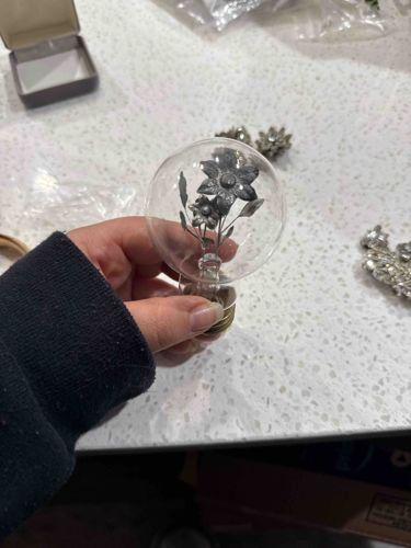 This is a vintage figural neon glow discharge light bulb, likely manufactured by the Aerolux Light Corporation or a contemporary rival such as Birdseye or Duro-Test, dating from the mid-20th century (circa 1930s-1970s). The bulb features a spherical clear glass envelope containing a sculptural metal filament assembly shaped like a bouquet of flowers, including two distinct blossoms with leaves on a stem. The internal electrodes are likely coated with phosphors that would glow in specific colors (typically pink, orange, or green) when ionized by neon or argon gas inside the bulb. The base is a standard brass Edison screw-type (E26). The glass surface appears clean without significant internal scorching, which often occurs with heavy use. The brass base shows a natural aged patina and slight oxidation consistent with age. These bulbs are valued for their decorative mid-century aesthetic and the unique way they use ionized gas to illuminate specific shapes rather than a standard thin wire filament. The craftsmanship is high, requiring precise assembly of the internal metal figures within the vacuum-sealed glass housing.