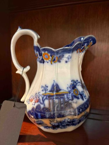 Victorian Era Flow Blue and Polychrome Chinoiserie Ironstone Pitcher