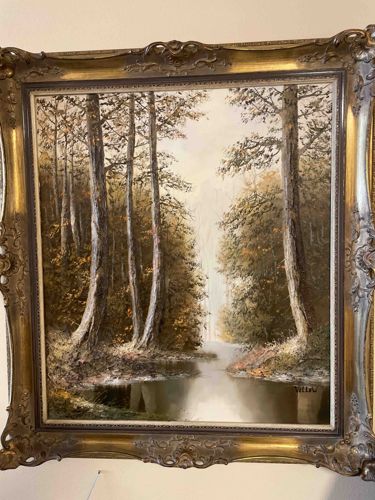 This item is a representational oil painting on canvas depicting a tranquil autumnal forest scene with a central waterway or reflective pond. The artwork utilizes a limited tonal palette consisting of ochre, burnt umber, cream, and olive green, characteristic of mid-to-late 20th-century decorative landscapes. The composition features tall, slender birch or poplar-like trees in the foreground, executed with heavy impasto texture on the trunks to create three-dimensional bark effects. A signature is visible in the lower right corner, appearing to read 'TILLO' or 'TILLU' in a stylized block script, often associated with studio artists of the 1960s-1970s. The piece is housed in a substantial, ornate gilded Rococo-style frame featuring decorative floral swags and scrollwork at the corners and mid-points. The frame includes a linen-textured inner liner that shows minor age-related discoloration. Overall, the painting appears to be in good vintage condition with stable paint layers, though the frame shows light surface wear and minor gilt loss consistent with its age. The atmospheric depth is achieved through misty, light-colored brushwork in the background, contrasting with the thick, textured application of the forest floor and foliage.