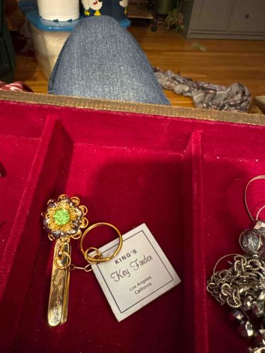 This is a vintage 'King's Key Finder' purse clip accessory, likely dating from the mid-20th century (circa 1950s-1960s). The item features a long, gold-tone metal clip designed to slide over the edge of a purse interior pocket, allowing keys to remain easily accessible. The decorative top is designed as a stylized flower, featuring silver-tone and gold-tone openwork filigree petals around a central light green (peridot-colored) faceted rhinestone. The clip body shows elegant engraved floral scrollwork on the gold-plated surface. Attached to the clip by a short gold-tone link chain is a circular split key ring. Accompanying the item is its original white paper tag printed with black text: 'KING'S Key Finder Los Angeles California.' The condition appears to be excellent vintage condition with minor surface patina and light wear to the gold plating, particularly on the edges of the clip. The craftsmanship is typical of mid-century costume accessories, combining functional utility with feminine, decorative aesthetics. The use of mixed metals (silver and gold tones) and the specific typography on the tag suggest a Southern California manufacturing origin during the post-war boutique accessory boom.