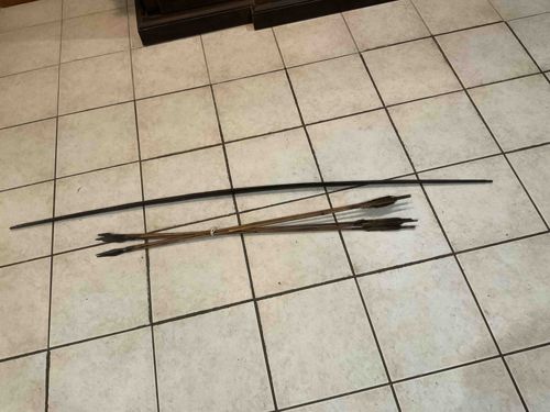 This set features a traditional longbow accompanied by three matching arrows, likely of indigenous or ethnographic origin. The bow is a single-piece construction, appearing to be crafted from a dark, dense hardwood or possibly palm wood, exhibiting a natural taper towards the tips. It measures approximately five to six feet in length. The bowstring appears thin and is likely composed of natural fiber or animal sinew, showing signs of aged tension. The three arrows feature slender shafts made of organic wood or reed, tipped with elongated, dark points that appear to be fire-hardened wood or bone. The fletching on the arrows consists of dark, natural feathers bound with fine fiber. Regarding condition, the set displays a significant aged patina; the wood surfaces show a matte finish with minor scuffs and surface wear consistent with age and use. There is no visible evidence of modern mechanical components, suggesting an early to mid-20th-century manufacture or a traditional contemporary replica. The craftsmanship is utilitarian yet refined, with smooth transitions and careful binding on the fletching and nocks, pointing to a skilled maker from a tribal or traditional archery background.